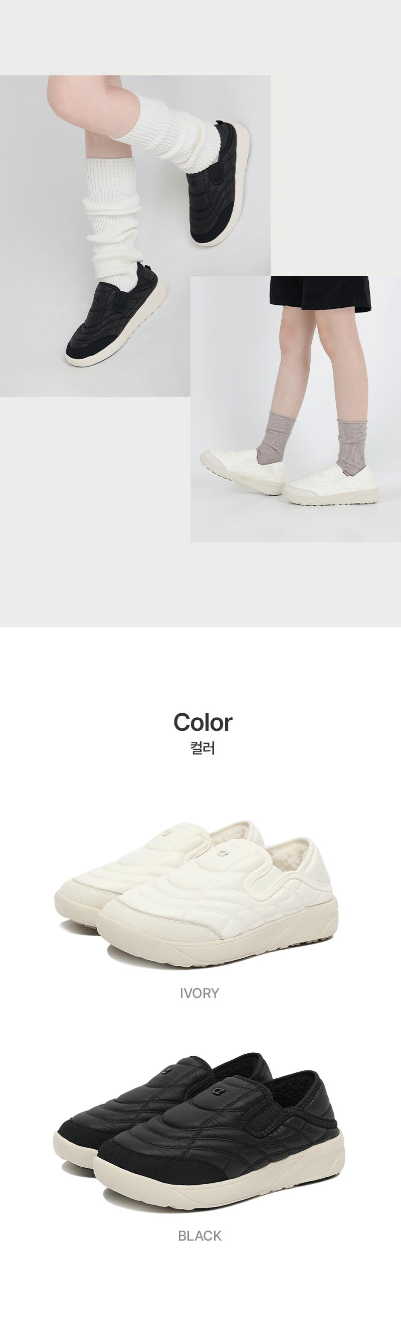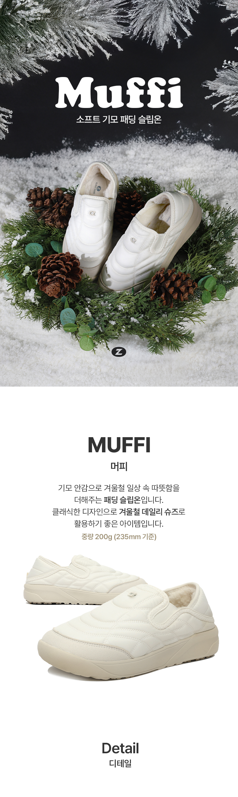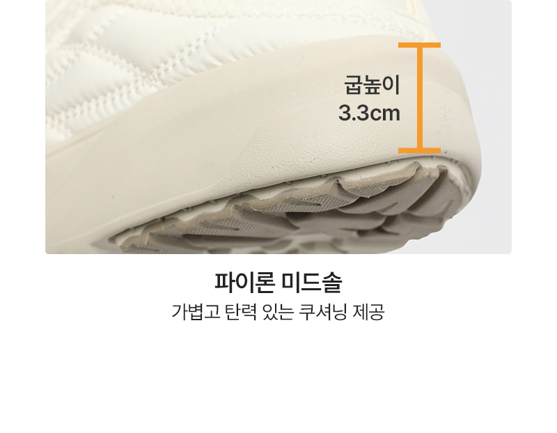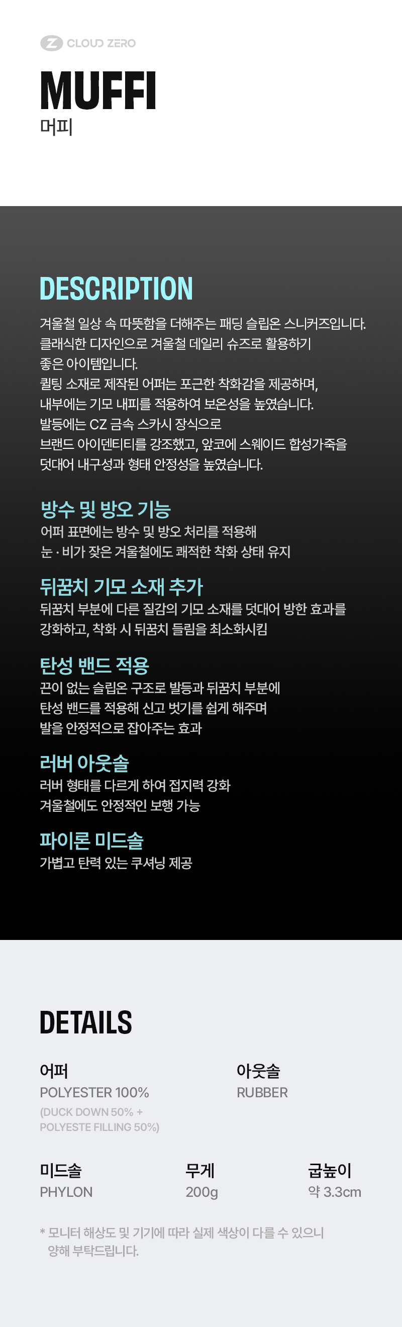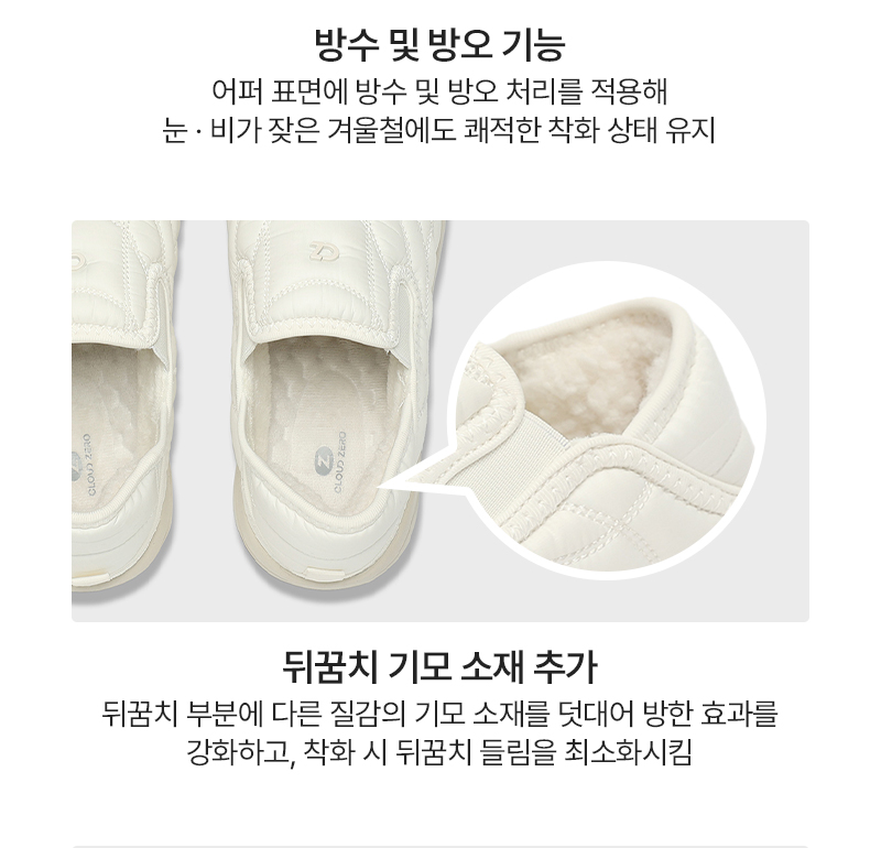 • 소재 어퍼: POLYESTER 100% (DUCK DOWN 50% + POLYESTE FILLING 50%) / 미드솔: PHYLON / 아웃솔: RUBBER