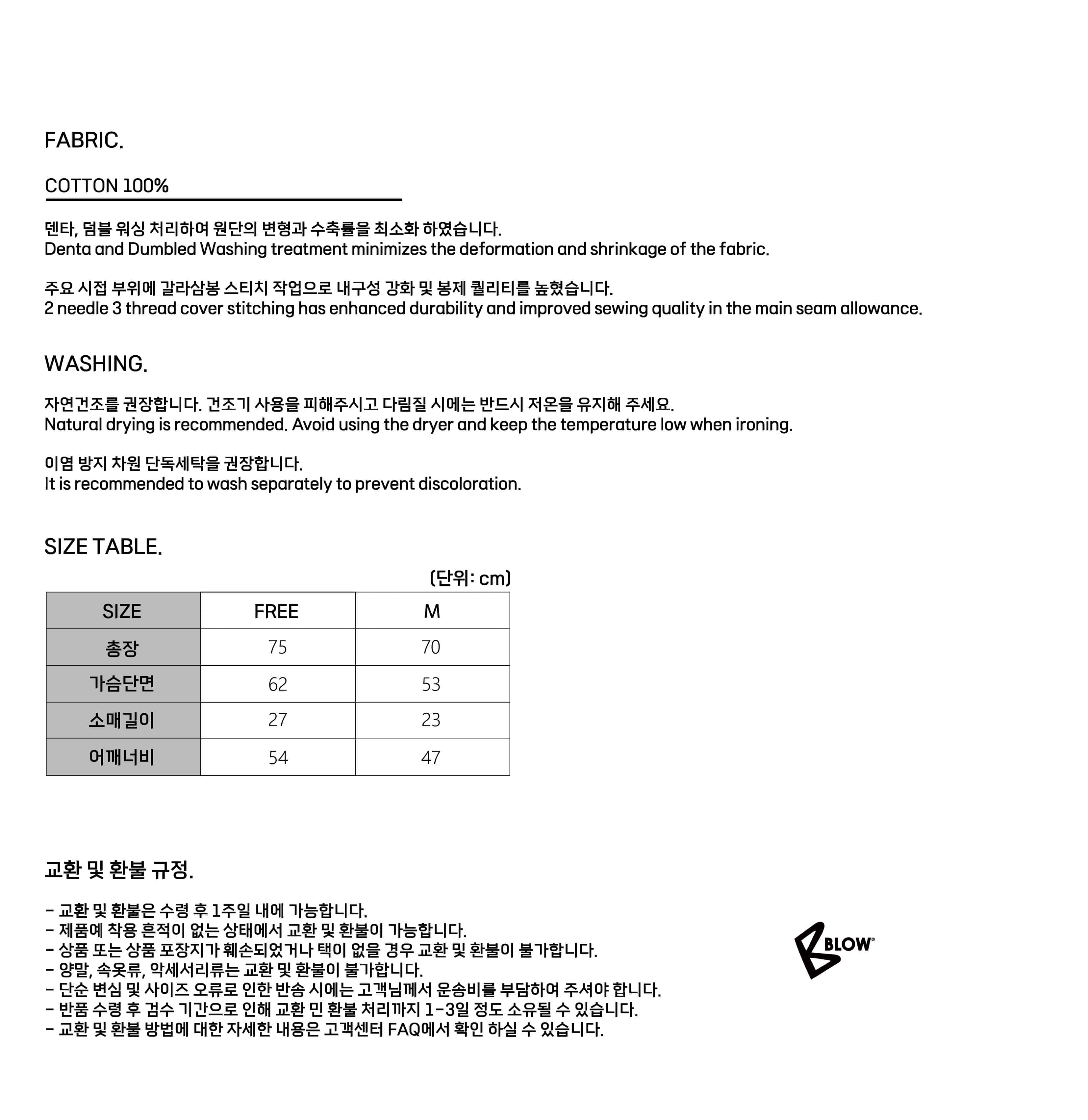 자연건조를 권장합니다. 건조기 사용을 피해주시고 다림질 시에는 반드시 저온을 유지해 주세요.