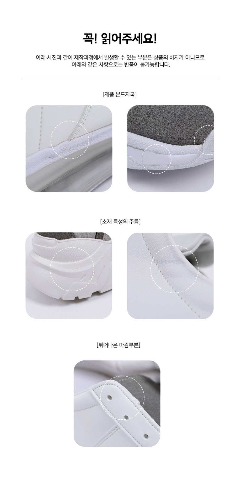 1. 신발의 외형보호를 위해 뒤꿈치를 꺾어 신지 마세요. 2. 화기에 절대로 가까이 두지 마세요. 3. 천연 가죽이나 천소재 상품은 물기 및 마찰에 의해 색깔이 변할 가능성이 있습니다. 4. 가벼운 오염물이 묻었을
